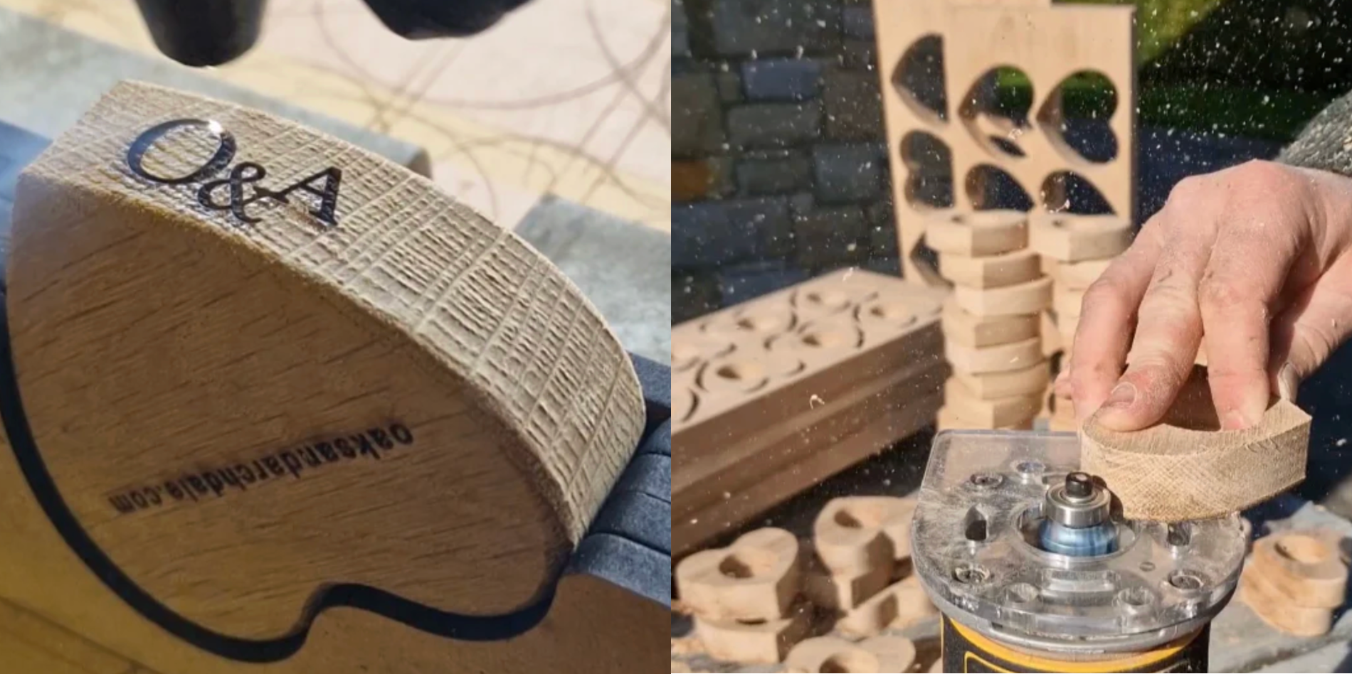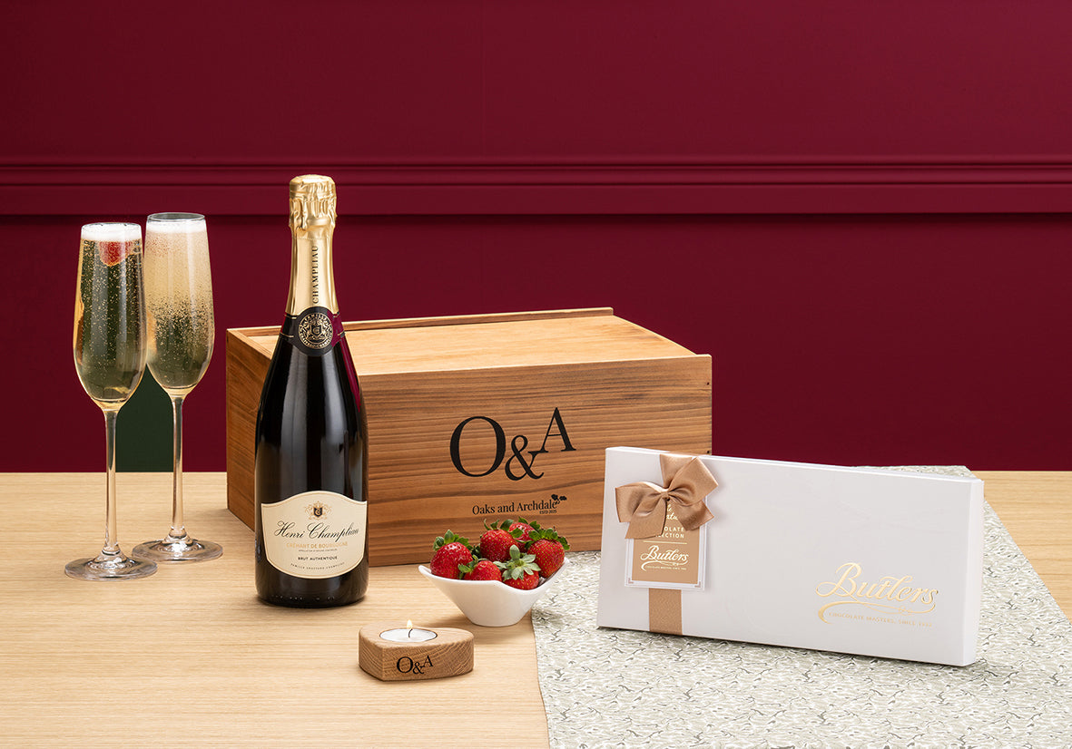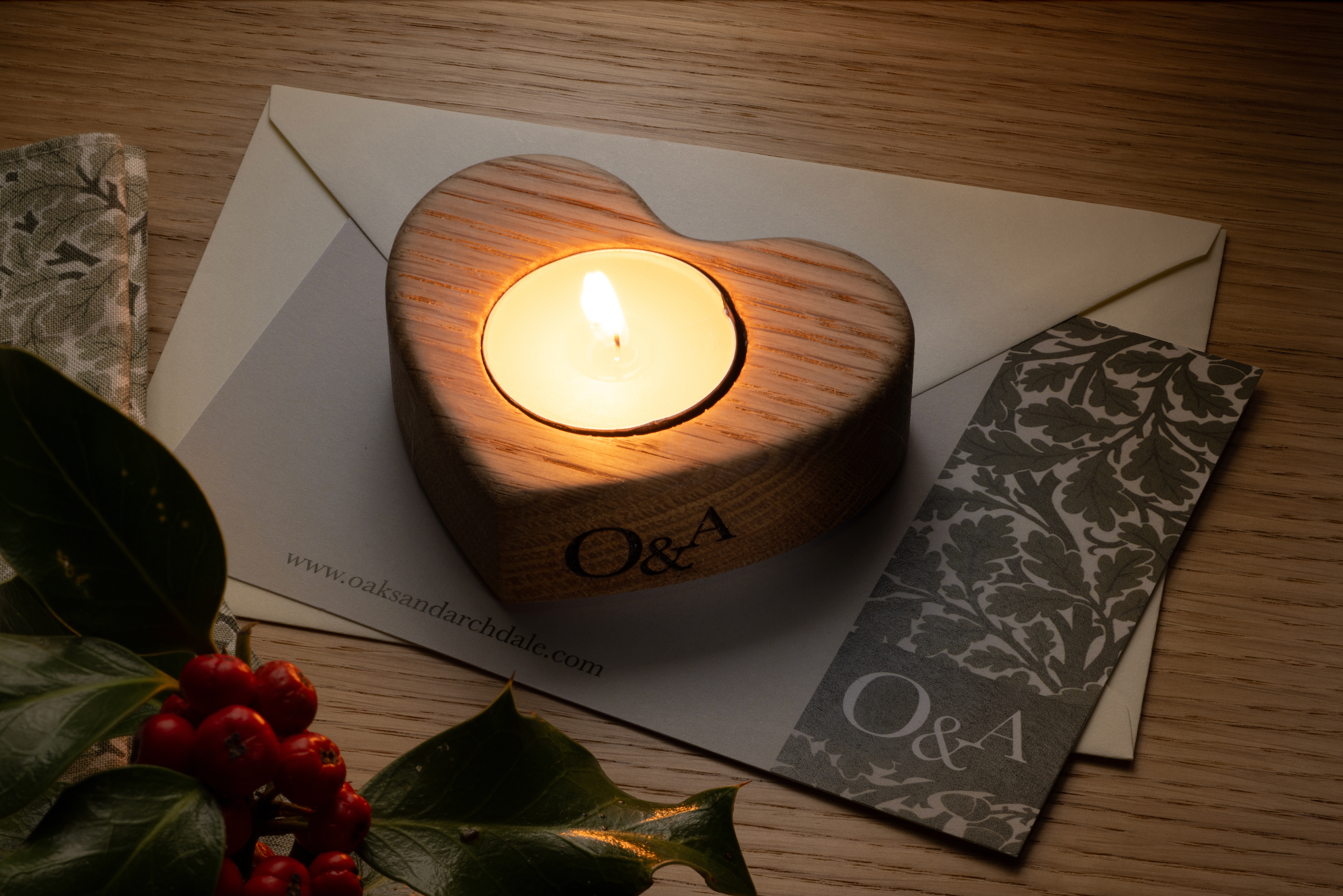 Each Oaks & Archdale luxury wicker hamper includes our signature heart shaped tealight votive made from responsibly sourced oak affectionately handcrafted in County Fermanagh